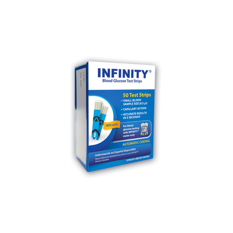 Infinity Test Strips are for use with the Infinity Blood Glucose Meters for the quantitative measurement of blood glucose level in whole blood. Infinity Test Strips are for testing outside the body (in vitro diagnostic use only). The Infinity Glucose Test Strip automatically draws blood into the test strip, and shows you if there is enough blood for an accurate reading.
