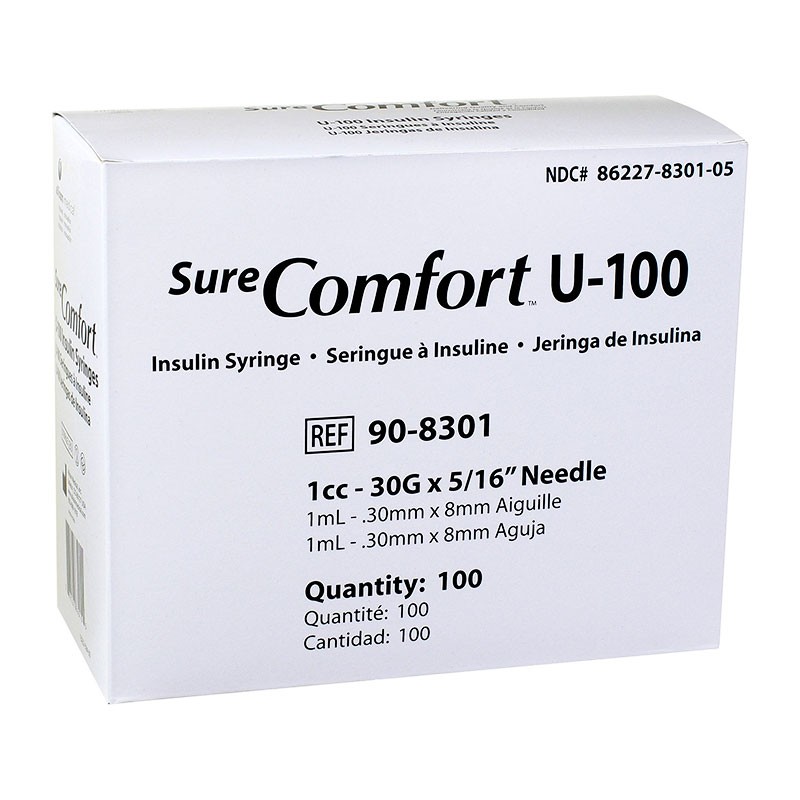 SureComfort U-100 Syringes Blister Pack are high quality syringes that are easy to use. These insulin syringes come with a lubricated needle for a more comfortable injection experience. SureComfort is designed with a larger grip for more control and bolder markings for accurate dosages.
